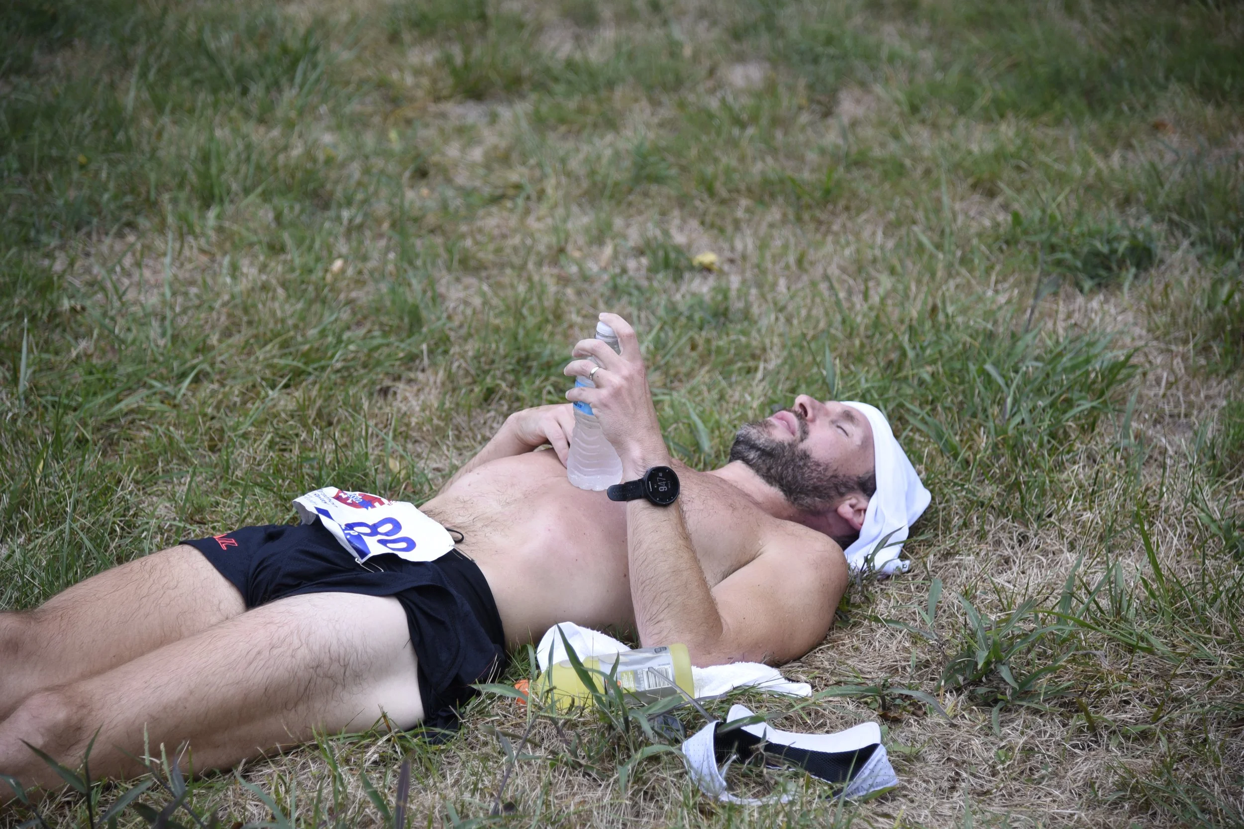 Jaume Padilla rests on the ground after finishing the Heart of America Marathon on Monday Sep. 5, 2022 at the Boone County History and Culture Center in Columbia. Padilla finished seventh in the marathon with a time of 3 hours, 34 minutes and 14 seconds.