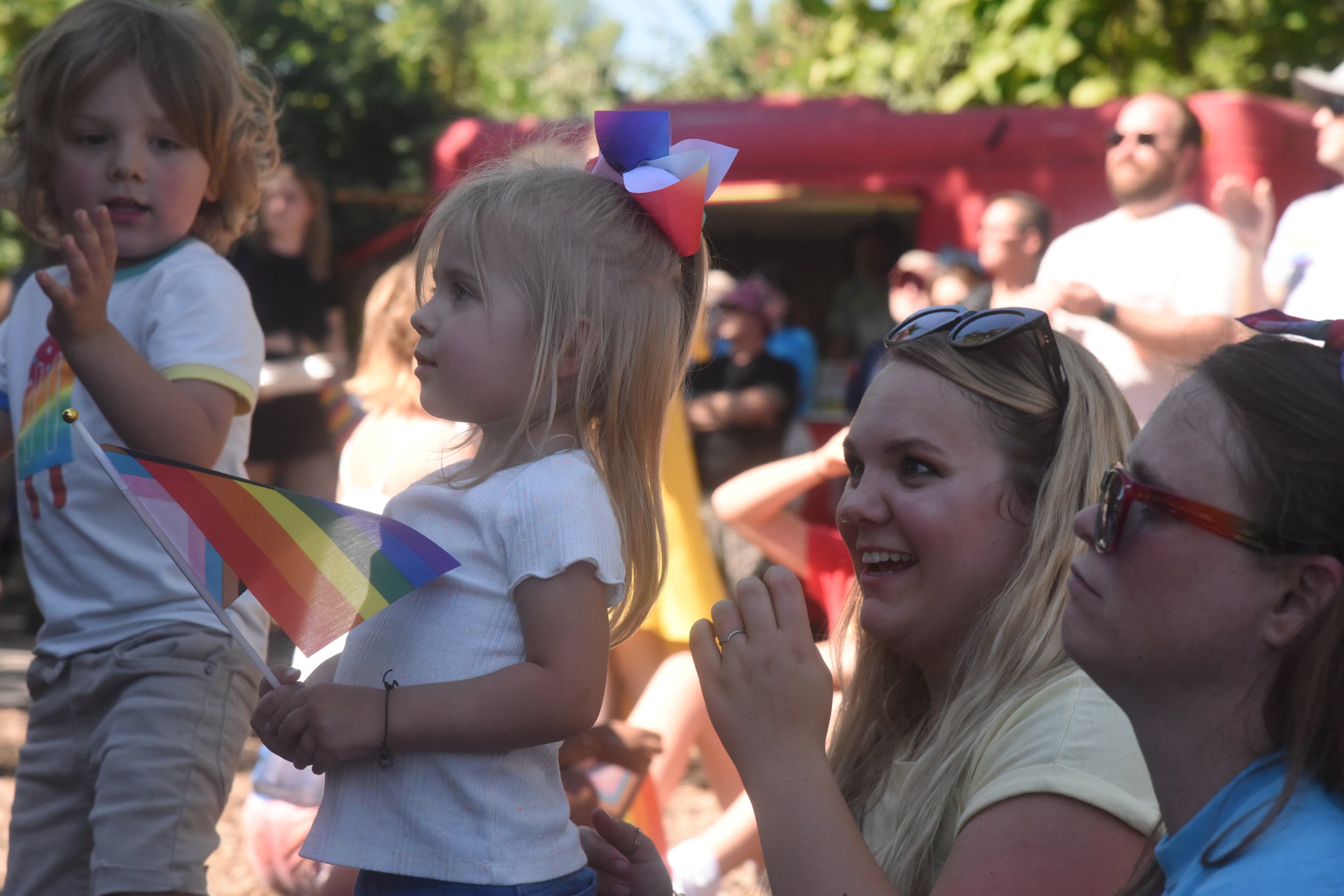 From left, Watson Allen, 3, Maeve Allen, 2, and Lindsey Allen cheer for the Quorus on Saturday Sep. 24, 2022 during the Mid-Missouri PrideFest at Rose Music Hall. Watson and Maeve danced during the performance.