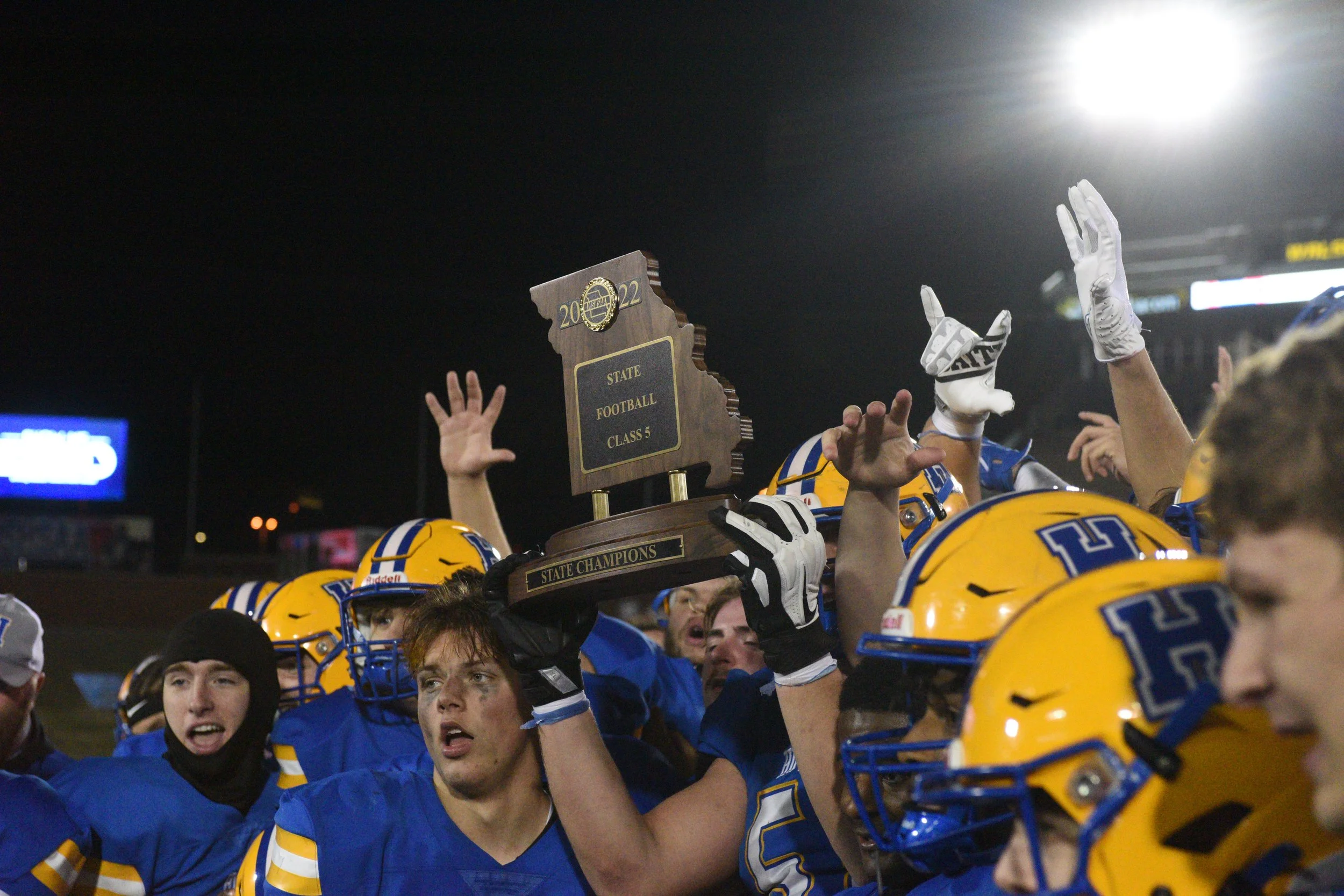 Francis Howell players display the MSHSAA Class 5 trophy after defeating Fort Osage 49-21 on Friday Dec. 2, 2022 at Memorial Stadium in Columbia. The win marked the Vikings’ first football state championship in school history. Francis Howell finished the season undefeated with a 14-0 record. Fort Osage finished the season 11-3.