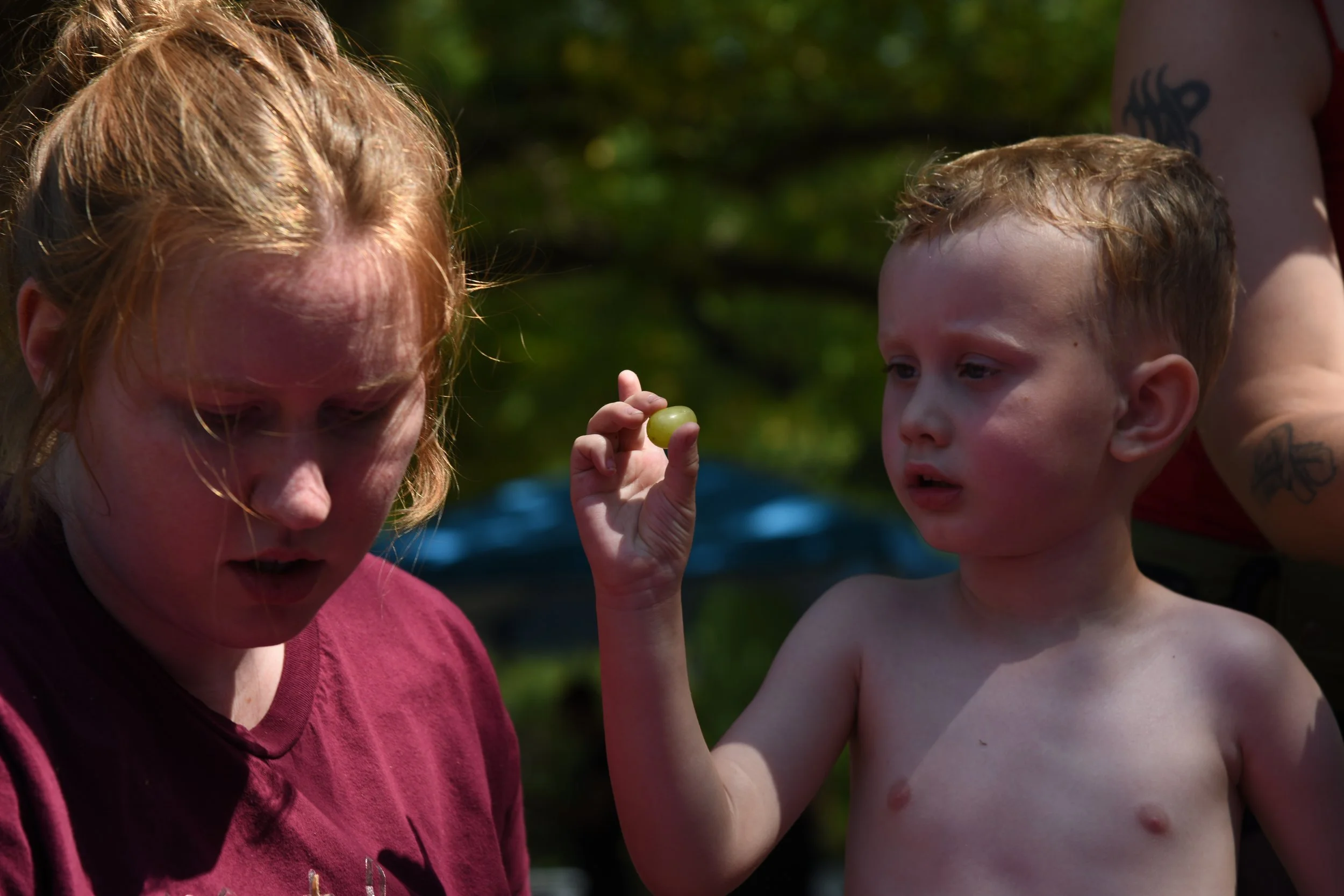 From left, Charli Leach and Roran Leach, 4, toss grapes into a small pool Saturday Sep. 3, 2022 in preparation for the annual grape-smashing at the Harvest Homecoming Festival at Oak Spirit Sanctuary in Boonville. The sanctuary uses the grapes to make its own wine to use for rituals throughout the year.